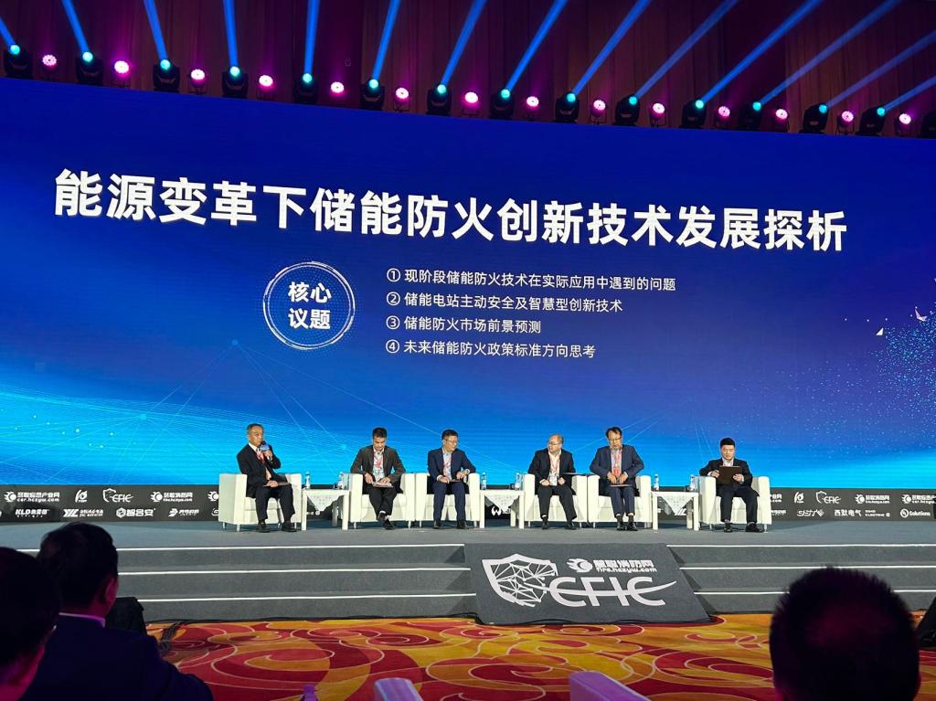 在能源變革下儲能防火創新技術發展探析高峰論壇環節,中國消防協會原秘書長高偉,中國建筑科學研究院建筑防火研究所汪茂海博士,青鳥消防股份有限公司副總裁、儲能消防業務CEO仇智珩,浙江華消科技有限公司副總裁趙莊順,海灣安全開利消防與安防亞洲區研發總監李本亮博士,安徽中科九安新能源有限公司總工朱興國等圍繞“現階段儲能防火技術在實際應用中遇到的問題、儲能電站主動安全及智慧型創新技術、儲能防火市場前景預測、未來儲能防火政策標準方向思考”等進行專業論壇。