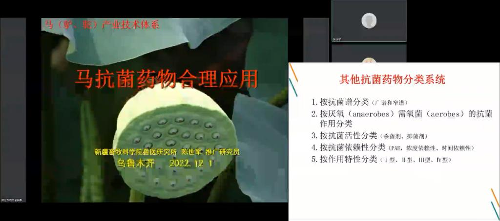12月1日——馬抗菌藥物合理應用,由新疆畜牧科學院獸醫研究所陳世軍老師授課,主要講述抗感染療法的基本思路、抗菌藥物的分類、抗菌藥物的作用機理以及抗感染療法的實際應用和注意事項。