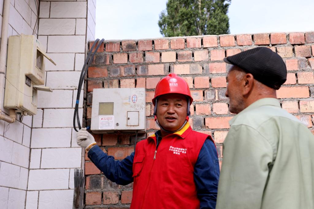 6月13日,學會會員單位昌吉供電公司電力科技工作者向村民哈斯木·哈哈爾講解用電安全常識