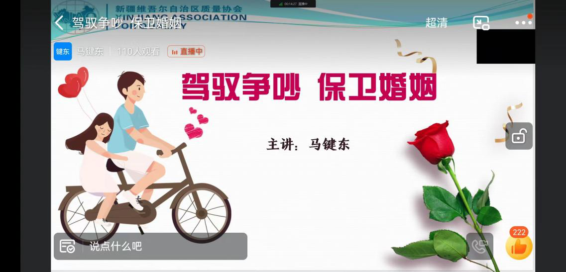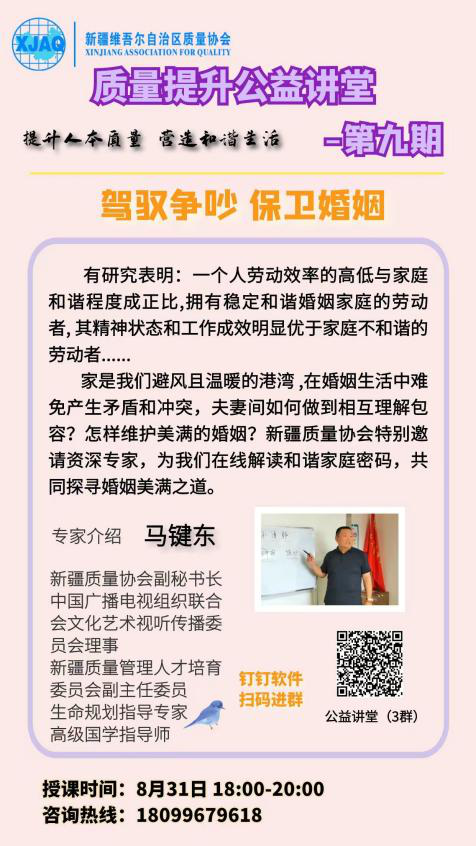 為更好的服務廣大質量工作者,提升全民質量素養(yǎng),完善道德修養(yǎng),建設和諧家庭。8月31日,新疆質量協(xié)會特邀專家圍繞“駕馭爭吵 保衛(wèi)婚姻”主題,以線上形式開展人本質量提升專項系列活動,在線解讀美滿婚姻密碼,共同探尋家庭和諧之道。