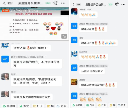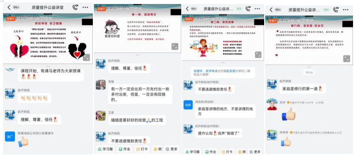 培訓中,專家針對駕馭爭吵的重要意義、夫妻間常見的14種爭吵、駕馭爭吵的6大技巧等內容為學員在線剖析如何正確經營婚姻關系。通過分享典型案例,引導學員正確認識婚姻關系,提升溝通能力和人本質量,創(chuàng)造和諧家庭。