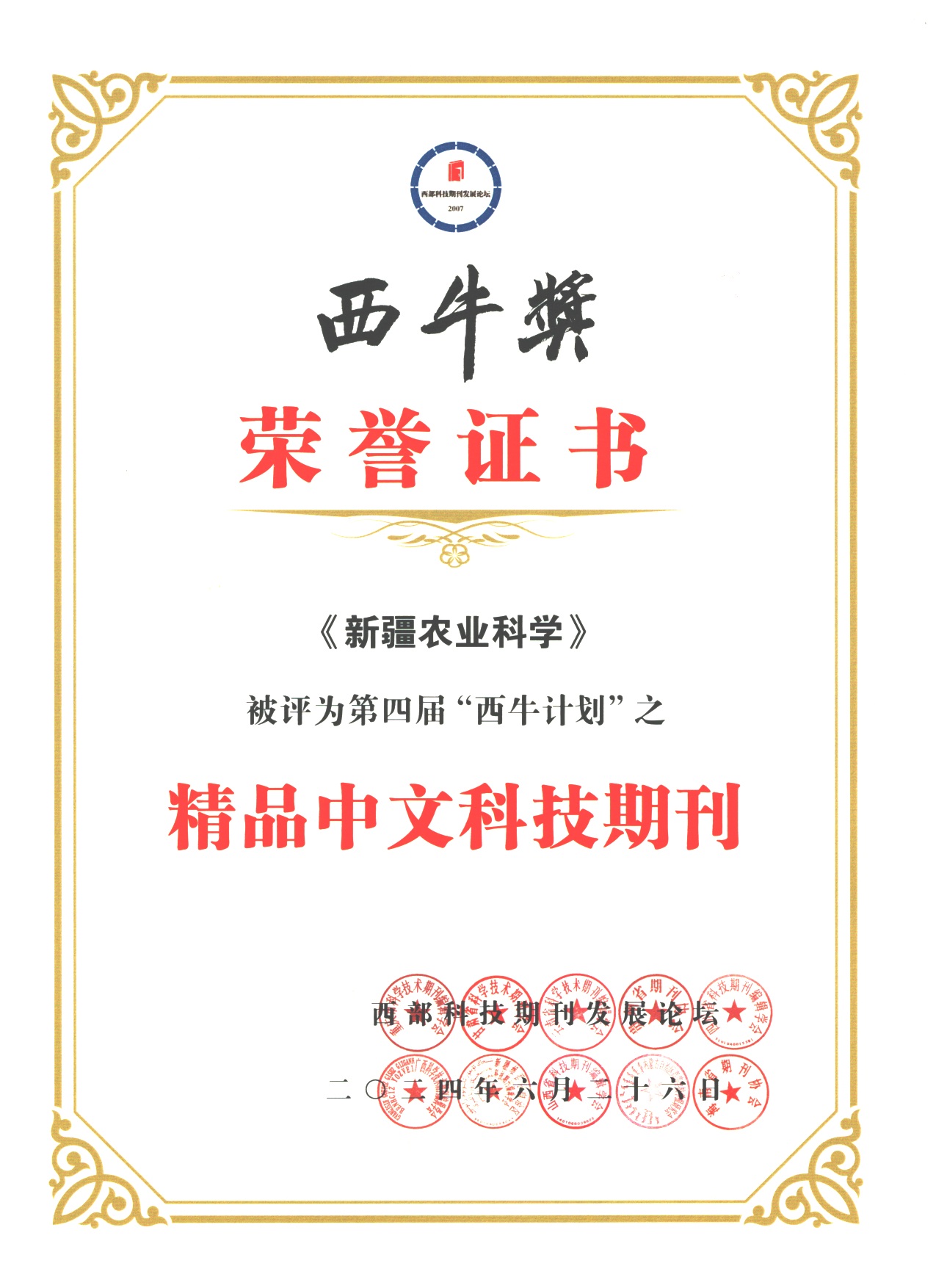 開幕式上進行了第四屆“西牛計劃”入選項目發布儀式。自治區科協資助期刊《新疆農業科學》被評為第四屆“西牛計劃”之精品中文科技期刊、優秀創新平臺;我刊編輯的論文《提升省級農業科技期刊質量及影響力數字化創新模式的研究與實踐》《基于CNKI的高校科技期刊發表論文文獻計量分析——以<新疆農業科學>刊登新疆農科院經作所為例》《基于CNKI的高校科技期刊發表論文文獻計量分析——以<新疆農業科學>刊登新疆農科院園藝所為例》被評為第四屆“西牛計劃”之優秀編輯學論著。高水平科技期刊不僅是學術交流和知識傳播的重要平臺,更是推動科技創新和產業發展的關鍵力量?!缎陆r業科學》也在不斷探索和創新科技期刊發展的新模式和新路徑,推動期刊與新質生產力的深度融合,為實現我區農業高質量發展奠定堅實的基礎。