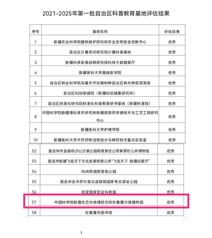 根據《自治區科普教育基地認定與管理辦法》(2022年修訂),自治區科協組織開展了2021-2025年第一批自治區科普教育基地評估工作。經各自治區科普教育基地自評、各評估工作組綜合評議、自治區科協黨組會議審議,擬評定中國科學院新疆生態與地理研究所吐魯番沙漠植物園等80個自治區科普教育基地為優秀等級,其余通過評估的66個自治區科普教育基地評定為合格等級。