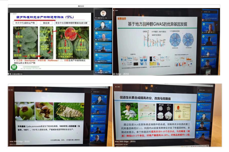 論壇邀請了北京市農林科學院蔬菜研究所許勇研究員,中國農科院鄭州果樹研究所副所長王力榮研究員,西北農林科技大學植物保護學院院長胡小平教授,東北農業大學農學院院長陳慶山研究員,西南大學生物技術中心肖月華教授分別作題為《西瓜甜瓜分子設計育種技術與實踐》《桃種質資源與遺傳育種研究進展》《外來入侵生物與糧食安全》《大豆生物育種資源創新與表型組學分析》《棉花轉基因改良》專題報告。專家們分別分享了西瓜、甜瓜、桃、大豆、棉花在種質資源創制與新品種選育方面的科研思路、技術手段以及育種成果;介紹了外來入侵物種的危害、對糧食安全的威脅,并對新疆如何有效防范外來生物入侵及管理提出了意見建議。