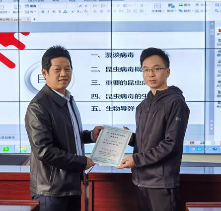 梁振普教授以科學(xué)認知新冠病毒為引子,從病毒的發(fā)現(xiàn)歷史、生物學(xué)分類、形態(tài)學(xué)特征、入侵機理,以及昆蟲病毒分離、培養(yǎng)和昆蟲病毒感染后的行為學(xué)等方面,系統(tǒng)介紹了病毒學(xué)知識和學(xué)科前沿進展,并以松毛蟲質(zhì)型多角體病毒在生物防控應(yīng)用為例,詳細介紹了“生物導(dǎo)彈”技術(shù),即以昆蟲病毒流行病學(xué)為基礎(chǔ),利用卵寄生蜂為傳播媒體,將病毒傳遞害蟲,從而使害蟲發(fā)生種群病毒病,起到大規(guī)模殺死目標害蟲的技術(shù),以及取得的階段性成果。梁振普教授報告深入淺出,將一個個生澀的概念和艱難發(fā)現(xiàn)與生活實例相結(jié)合,風(fēng)趣生動,躍然紙上,參加報告會的專家學(xué)者紛紛表示報告內(nèi)容豐富,受益匪淺。
