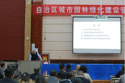 新疆農業大學林學與風景園林學院院長、教授阿迪力?沙塔爾做了新疆城市綠地外來入侵物種的識別與防治的報告。