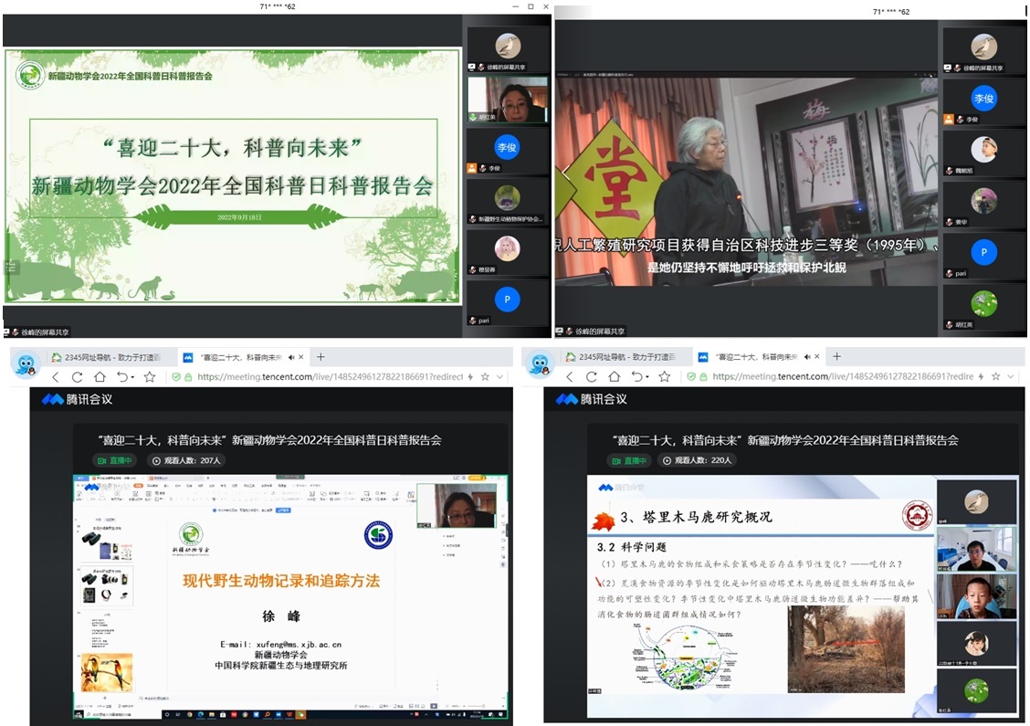 2022年9月18日,新疆動物學(xué)會通過騰訊會議及網(wǎng)絡(luò)直播方式舉辦了“喜迎二十大,科普向未來”新疆動物學(xué)會全國科普日活動。本次活動主要由新疆動物學(xué)會主辦,新疆大學(xué)生命科學(xué)與技術(shù)學(xué)院、新疆師范大學(xué)生命科學(xué)學(xué)院、中國科學(xué)院新疆生態(tài)與地理研究所以及新疆中學(xué)生生物競爭專業(yè)委員會協(xié)辦,來自新疆各高校及中小學(xué)的500余名師生參加了本次科普日活動。新疆動物學(xué)會秘書長胡紅英教授主持了活動開幕式。