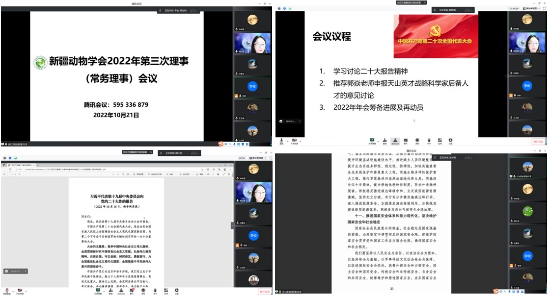 此次黨的二十大精神學習座談會,新疆動物學會20余名理事參加了線上交流,參會理事表示將認真學習領會、深入貫徹黨的二十大精神,扎實做好學習宣傳工作,確保黨的二十大精神入腦入心;在今后的工作中,將凝心聚力、埋頭苦干、勇毅前行,更好的完成學會的各項任務。