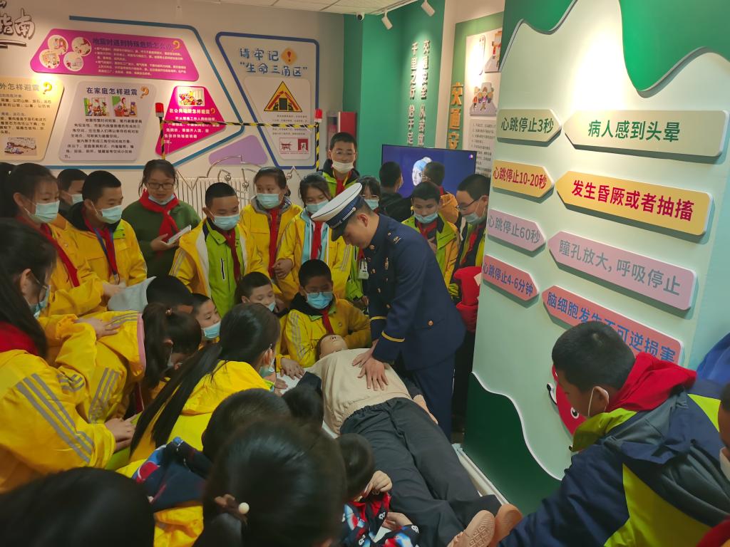 在三樓消防安全展區,科技館工作人員邀請到了塔城市消防大隊的消防員為學生們講解消防器械的使用和消防安全知識。