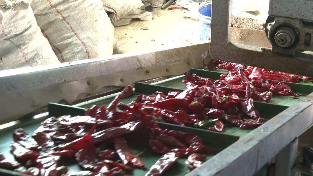 車間內(nèi),工人們正把經(jīng)過機器分揀的剪把辣椒進行二次分揀,確保初加工的產(chǎn)品質(zhì)量。而合作社的發(fā)展也為當(dāng)?shù)靥峁┝瞬簧倬蜆I(yè)崗位。