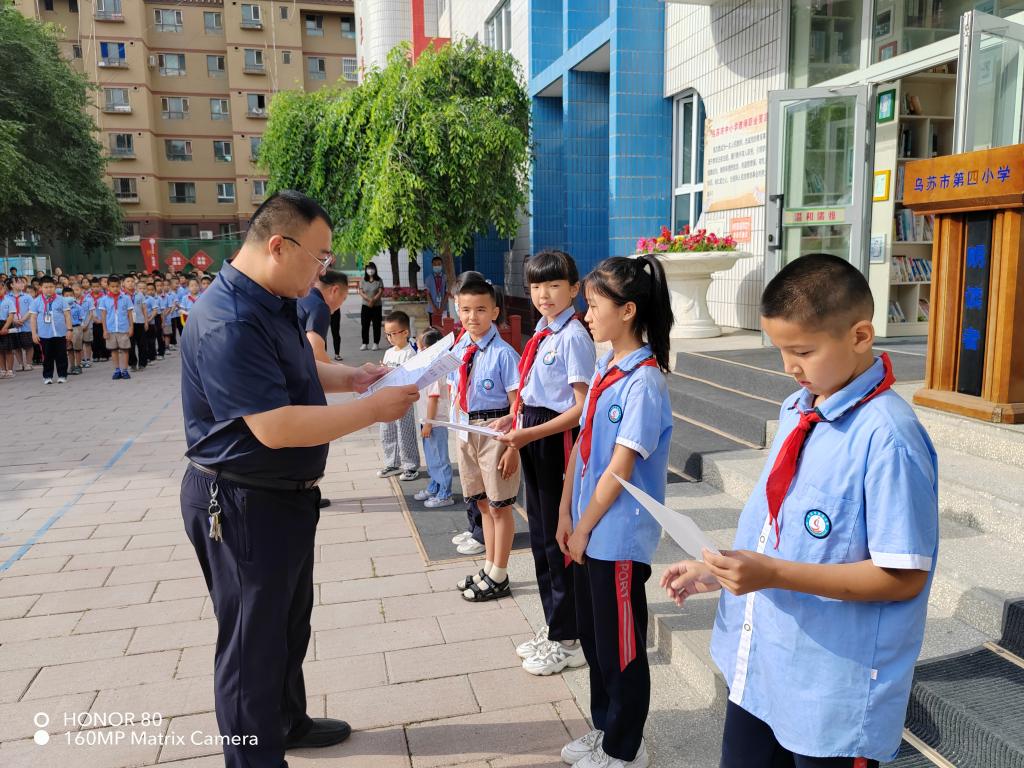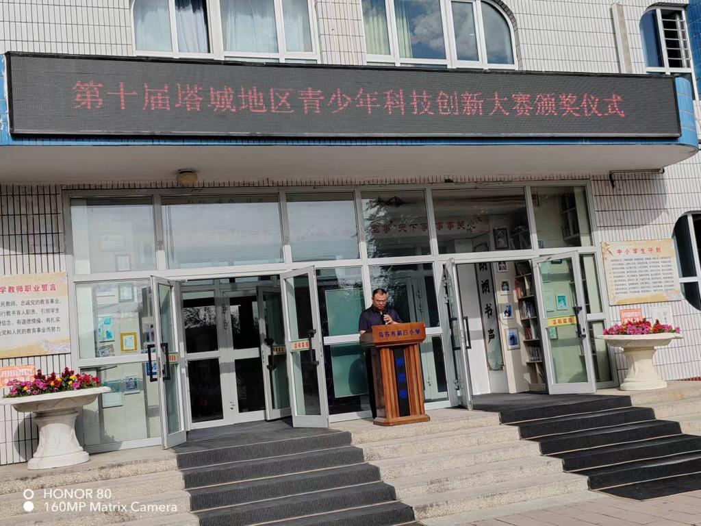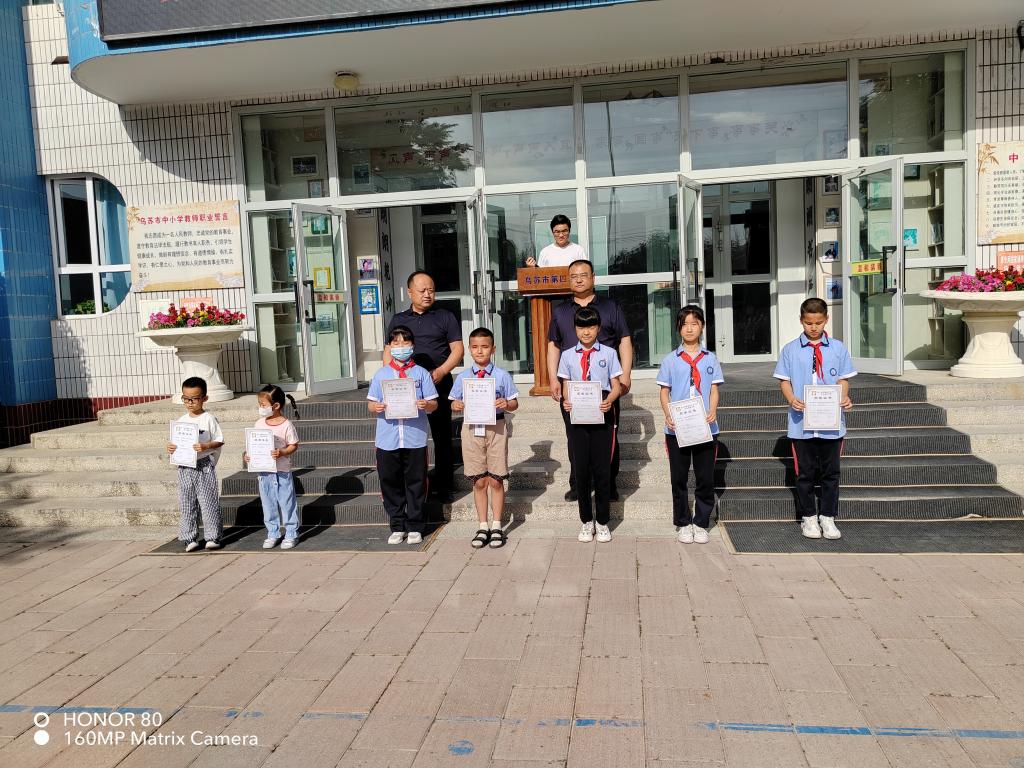 升旗儀式結束后,烏蘇市科協黨組書記、副主席劉彥超,烏蘇市第四小學書記一同在國旗下為獲獎同學頒發獎狀,此次活動不僅是對獲獎學生的一種肯定,更是對全校學生的一種激勵。