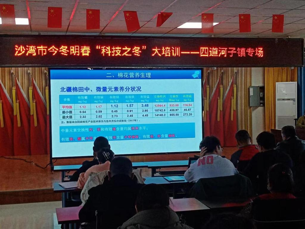 12月5-6日,沙灣市科協(xié)邀請(qǐng)中國(guó)農(nóng)業(yè)科學(xué)院棉花研究所副研究員馮路、韓迎春、楊北方,前往四道河子鎮(zhèn)、老沙灣鎮(zhèn)、商戶地鄉(xiāng)開(kāi)展2023-2024年塔城地區(qū)沙灣市今冬明春“科技之冬”大培訓(xùn),各村干部、農(nóng)村合作社技術(shù)員及農(nóng)戶約500人參加培訓(xùn)。