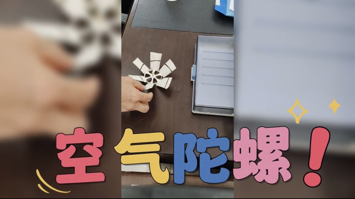第二小學(xué)的陳沖老師和李璐璐老師給大家?guī)?lái)了“火山爆發(fā)”和“空氣陀螺”兩個(gè)實(shí)驗(yàn)秀。油和水密度不同,倒在一起產(chǎn)生了分層現(xiàn)象,再加入泡騰片,泡騰片溶于水后產(chǎn)生氣體,沖出油層宛若火山爆發(fā)一般。口吹空氣陀螺實(shí)驗(yàn)利用一個(gè)一次性紙杯,杯壁剪成風(fēng)輪葉片,杯底鏤空,中間插一根小棍做成轉(zhuǎn)軸,就做成了一個(gè)簡(jiǎn)單的桌面小玩具——桌面口吹陀螺。