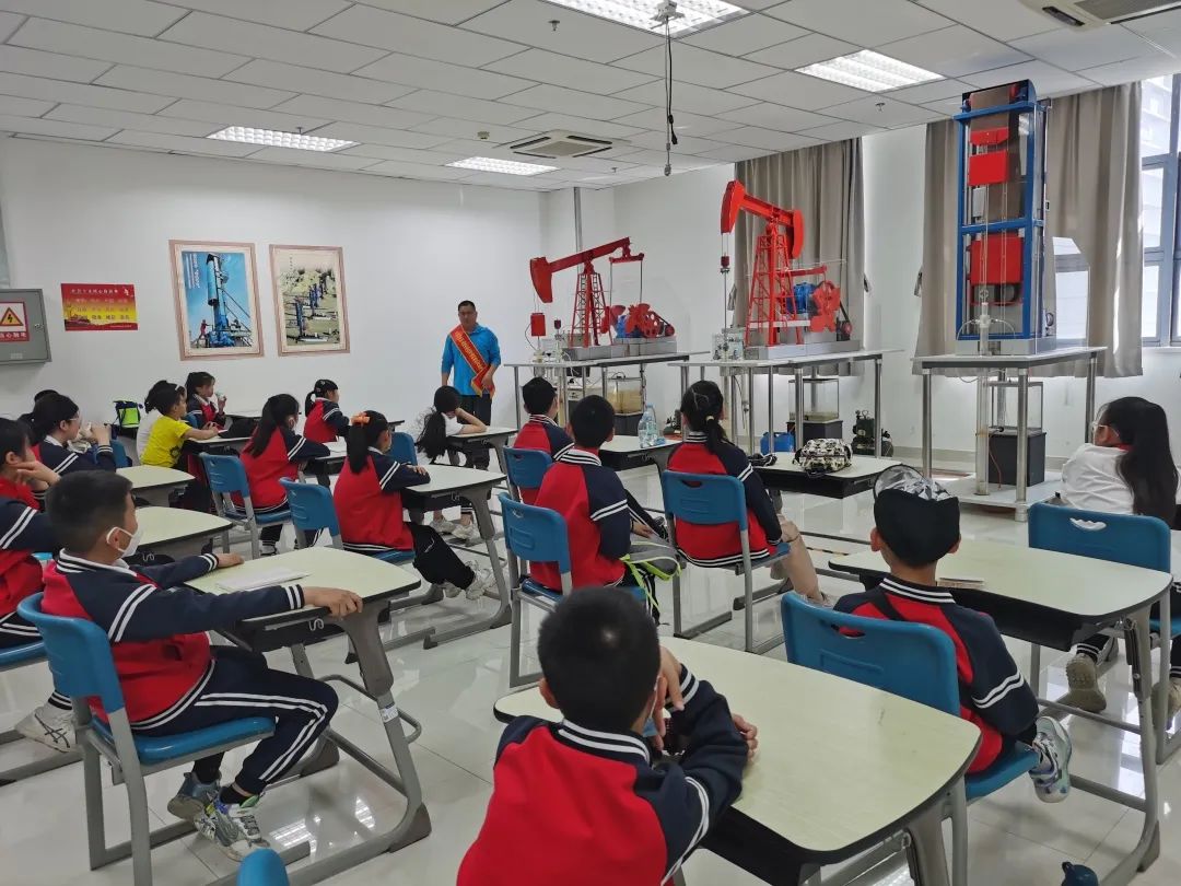 各班級(jí)分別以“風(fēng)城組”“石西組”“瑪湖組”命名,參觀了紅山湖白堊系沉積剖面、古生物實(shí)訓(xùn)室、鉆井模擬實(shí)訓(xùn)室、抽油機(jī)模型實(shí)訓(xùn)室、儲(chǔ)運(yùn)實(shí)訓(xùn)室、壓裂實(shí)訓(xùn)室、HSE應(yīng)急演練實(shí)訓(xùn)室,依次讓學(xué)生了解了石油產(chǎn)生的原因、形成的原理、發(fā)現(xiàn)的過(guò)程、采油的流程、運(yùn)輸及提煉的過(guò)程。每個(gè)實(shí)訓(xùn)室里都有實(shí)操模型,配合生動(dòng)的動(dòng)畫(huà)講解,孩子們?cè)谟螒蛑畜w驗(yàn)了石油的“前世今生”。孩子們動(dòng)手操作,切切實(shí)實(shí)做了一回“石油娃”。參觀模擬過(guò)程中,孩子們興致勃勃,了解到了關(guān)于石油的許多知識(shí),更在體驗(yàn)的過(guò)程中感受到了石油資源的寶貴、石油工人的辛苦,同時(shí)對(duì)被譽(yù)為“共和國(guó)石油長(zhǎng)子”的家鄉(xiāng)有了更深的責(zé)任感和使命感。