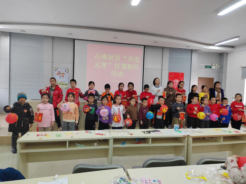 在孩子們歡快的笑聲中,科技志愿者開始分發(fā)材料包,講解燈籠的制作步驟。拿到材料包的孩子們迫不及待地打開材料包跟著家長一起研究起來。在爸爸媽媽的協(xié)助下,孩子們小心翼翼地按照圖解說明組裝燈籠,然后給燈籠底部裝上彩燈,頂部裝上燈桿,再掛上流蘇,一個漂亮的元宵燈籠就誕生了。隨后,孩子們和家長代表一起來到古南社區(qū)廣場,將自己親手制作的元宵燈籠掛在了休憩長廊上,孩子們看著自己親手制作的燈籠成就感滿滿,紛紛與自己制作的燈籠合影留念。