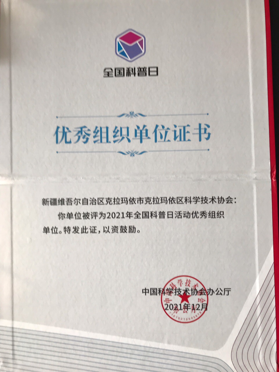 近日,克拉瑪依區(qū)科協(xié)收到中國科協(xié)辦公廳頒發(fā)的“優(yōu)秀組織單位證書”.