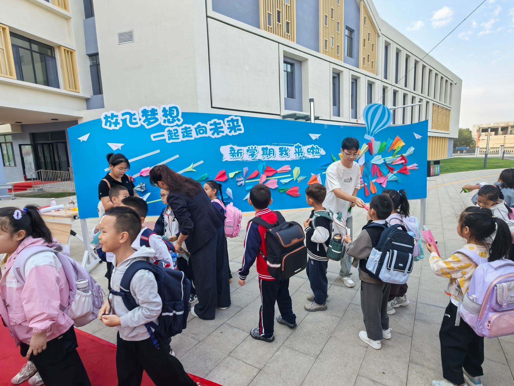清晨的東彩小學(xué)門口,科技館的大黃蜂機(jī)器人揮“臂”迎接新同學(xué),指引至簽到區(qū);同學(xué)們將寫有名字與心愿的專屬紙飛機(jī)貼紙粘貼到“夢想啟航”的展板上,滿是童真與期許。