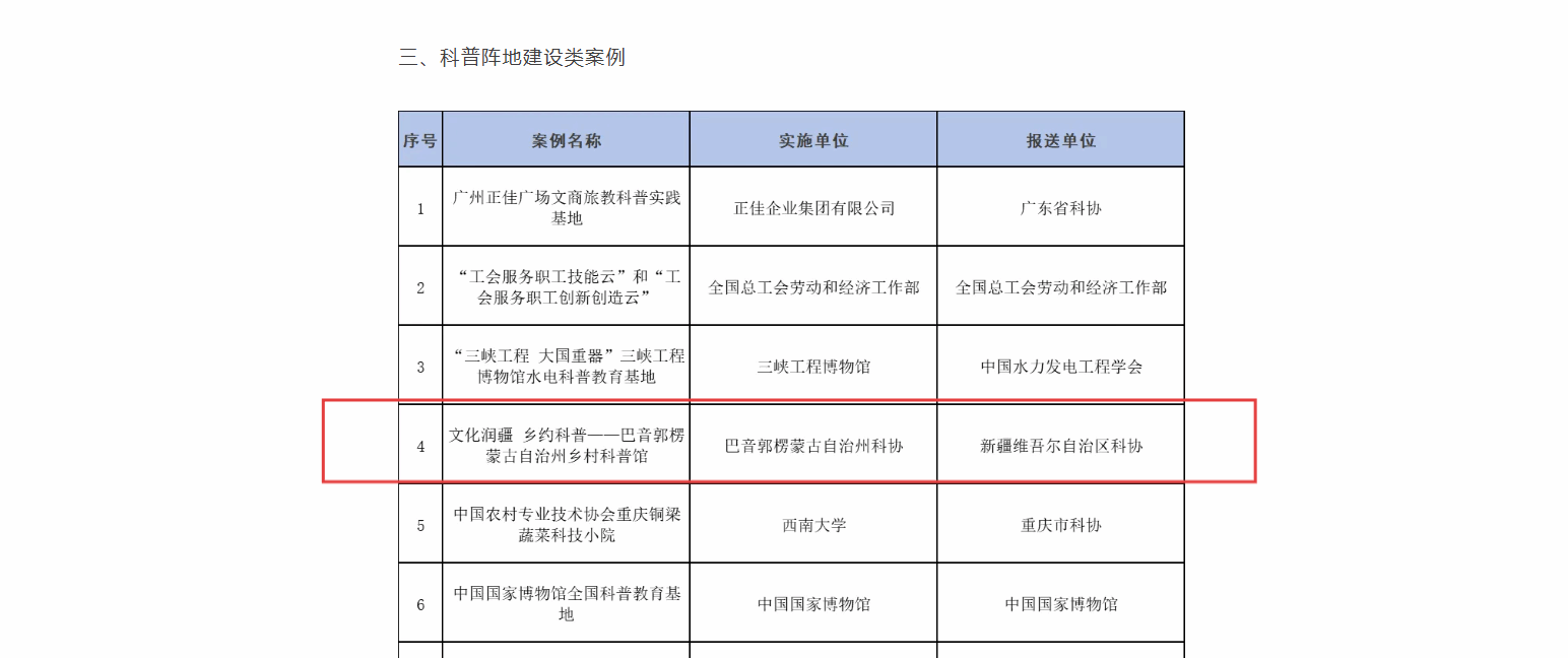 近日,2025年度“典贊?科普中國”百佳科普案例名單正式揭曉,巴州科協打造的“文化潤疆鄉約科普——巴音郭楞蒙古自治州鄉村科普館”案例,成功入選科普陣地建設類百佳案例。這一國家級榮譽,既是對巴州科普工作創新實踐的高度認可,更是“文化潤疆”戰略在巴州科普領域落地生根、開花結果的生動縮影。